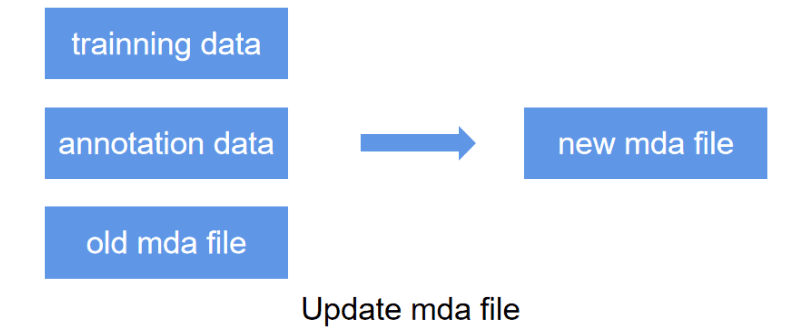 Update .mda file. To update the mda file, specify the modified training data path, annotation data path, and the path of the previous version of the .mda file.